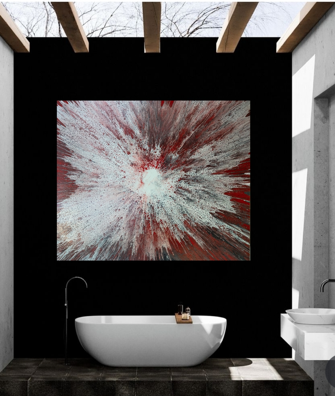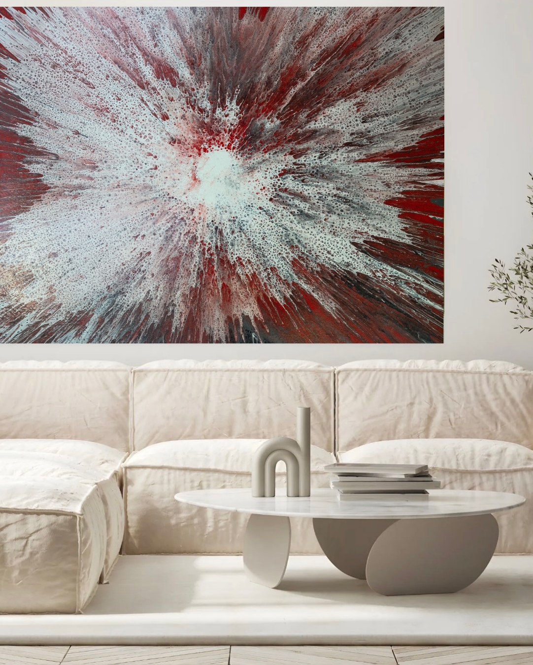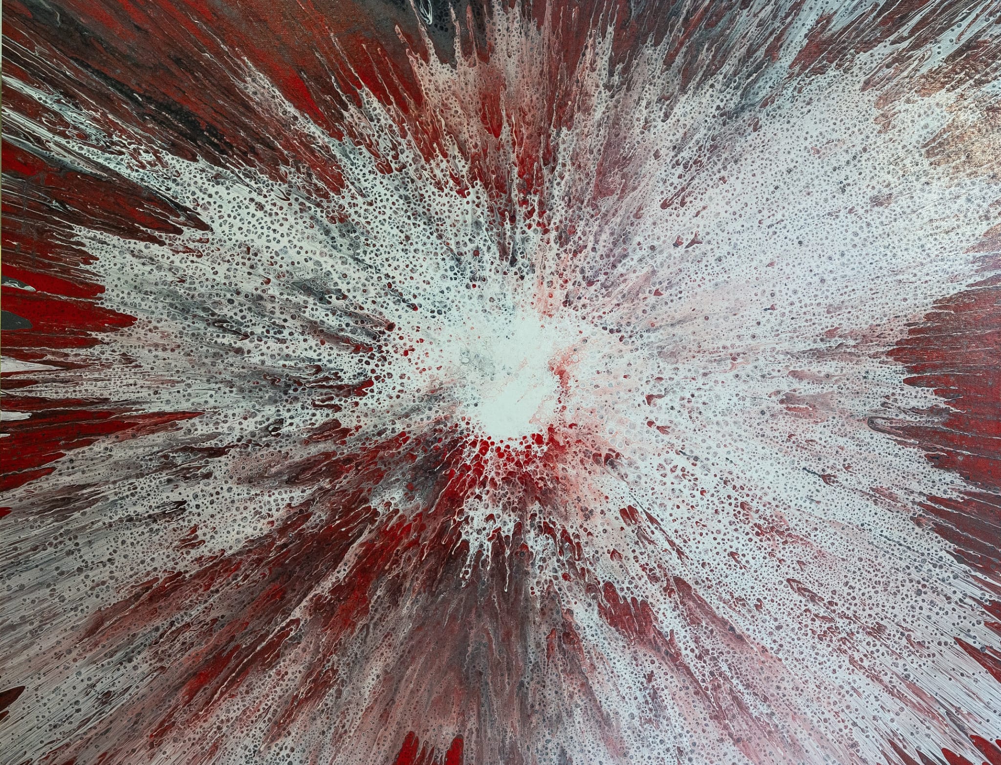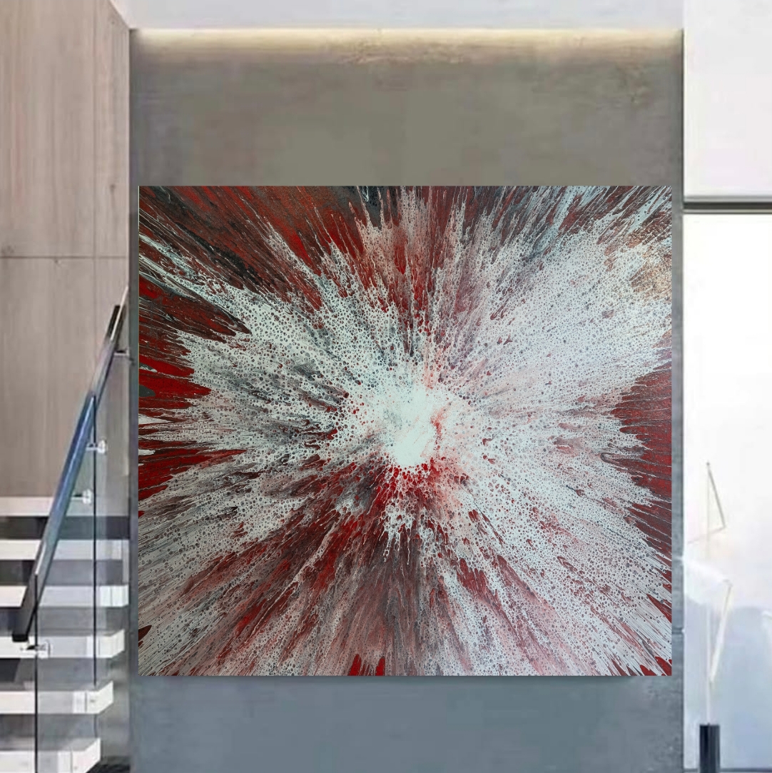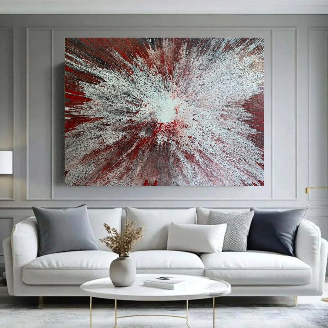 Obra abstracta contemporánea en acrílico sobre lienzo, donde la intensidad del rojo se fusiona con blancos y matices oscuros en una explosión radial cargada de fuerza y emoción. La composición transmite energía, expansión y profundidad, creando un efecto visual impactante que capta la atención desde cualquier ángulo.